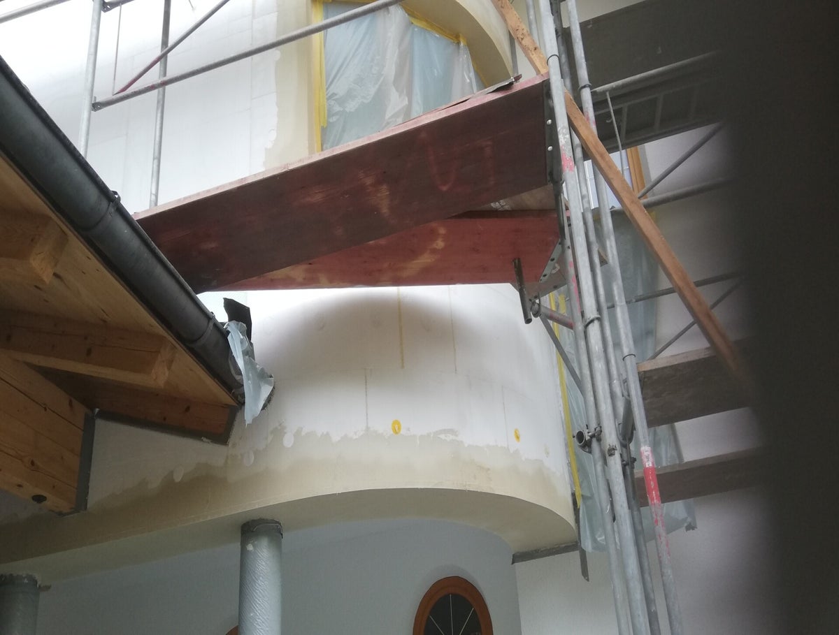 Darauf aufbauend wurde von uns ein sorgfältiger Putzaufbau durchgeführt: Beginnend mit einer zweilagigen Armierungsspachtelung inklusive Gewebeeinbettung, über die Planspachtelung und Grundierung, bis hin zur finalen Endbeschichtung.